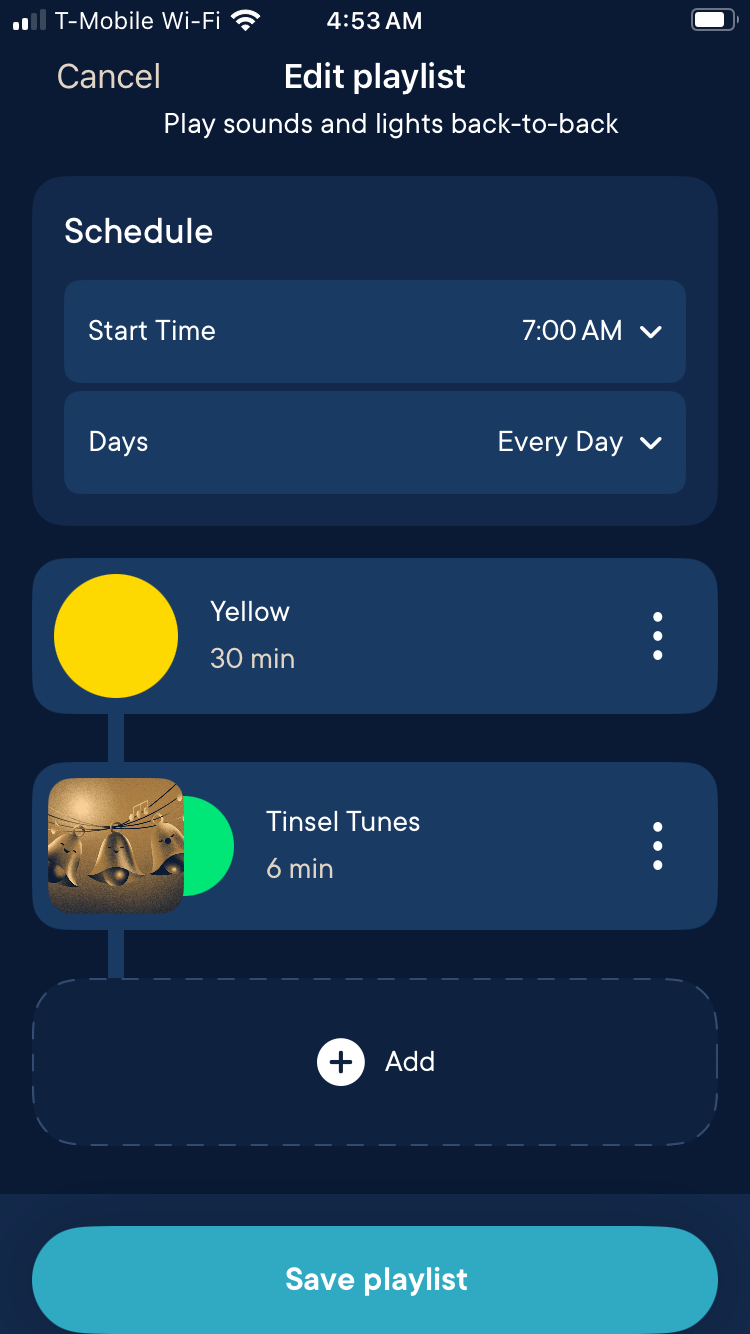 If your little one has a habit of waking too early, we'd recommend using the Playlist feature and teaching your little one which color means it's time to stay in bed and which color means it's ok to get up! You can let your little one pick the colors themselves for a boost to their independence!