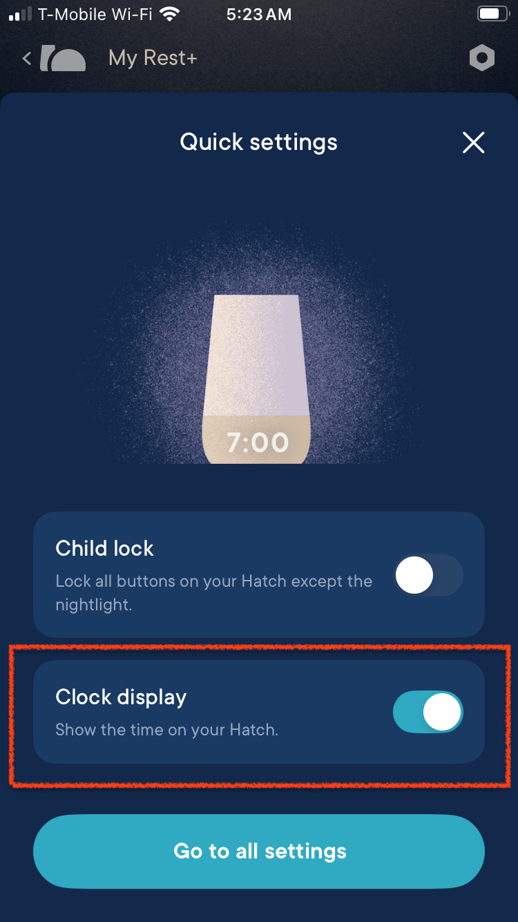 - To set a Custom Schedule for your clock – Tap Set Custom Schedule towards the middle of the screen. Set a time for the Display to turn off and on. For example, schedule your clock display to automatically turn off between 10:00 pm to 7:00 am. Hatch Tip: we recommend this for sleeping hours to minimize light in the room.