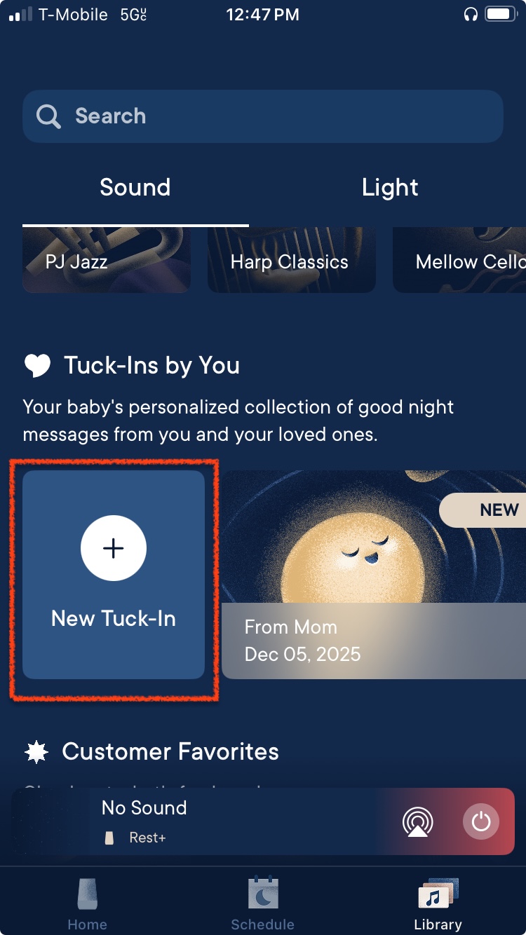 To get started with a Tuck-In, you will need to first make sure you are a Hatch+ subscriber! Once you are signed up for Hatch+, you can invite your loved one to record their own message. To invite a loved one, navigate to the "Library" tab and tap on the "New Tuck-In" option.