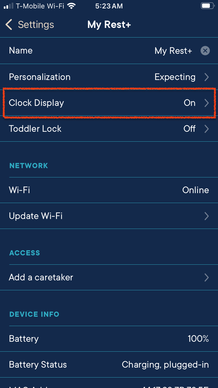- Tap on Clock Display to navigate to the Clock Display menu. (Note: If you don't see the Clock Display option in Settings, your Rest may be offline or you may not be actively connected to the device)